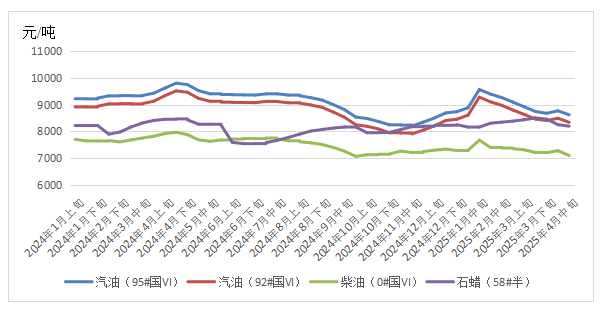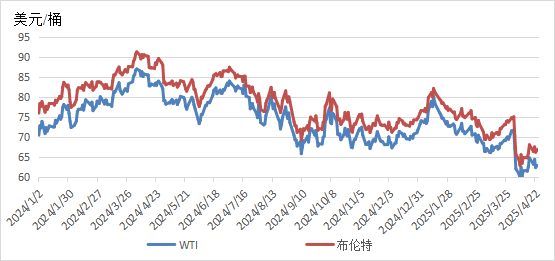 4月中下旬,虽然欧佩克、IEA下调全球需求预测,推动欧美原油期货小幅下跌。但部分电子产品获得美国关税豁免,“欧佩克+”列出超产补偿计划,美国对伊朗石油出口实施新制裁、延长对俄罗斯制裁,美国和欧盟有望达成贸易协议等讯息支撑市场,WTI原油期货价格持续上涨至64美元/桶以上。