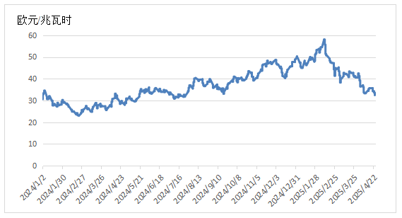 截至4月25日,TTF天然气期货主力合约收于32.432欧元/兆瓦时,月环比下降21.95%,相较2024年同期的29.77欧元/兆瓦时,上涨8.94%。