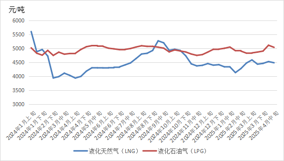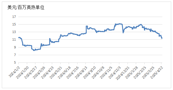 截至4月25日,普氏日韩LNG(JKM)期货价格收于11.27美元/百万英热单位,月环比下降14.30%,相较2024年同期的10.43美元/百万英热单位,上涨8.05%。