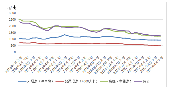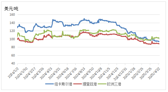 截至4月25日,澳大利亚纽卡斯尔港煤炭期货价格报收于93.75美元/吨,月环比下降2.75%,相较2024年同期的129.25美元/吨,下降27.47%;南非理查兹港煤炭期货价格报收于88.1美元/吨,月环比上涨1.15%,相较2024年同期的106.75美元/吨,下降17.47%;欧洲三港煤炭期货价格报收于102.4美元/吨,月环比上涨5.13%,相较2024年同期的118.65美元/吨,下降13.70%。