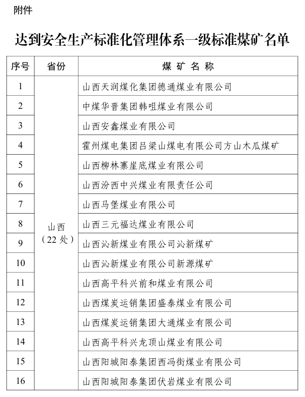 附件:达到安全生产标准化管理体系一级标准煤矿名单