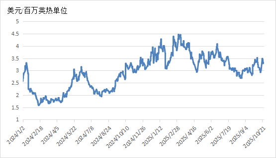 10月中下旬,美国大部分地区天气转冷,燃气发电需求有所上涨,LNG出口工厂的进气量稳定增长,加之库存增幅超出预期,基本面出现边际收紧迹象。此外,地缘政治因素亦对市场形成扰动,美国宣布制裁俄罗斯最大的两家石油企业,欧盟正式通过对俄罗斯第19轮制裁方案,首次将俄罗斯天然气行业纳入打击范围,进一步提振市场看多情绪,美国天然气期货价格反弹。10月22日,美国Henry Hub天然气价格收于3.439美元/百万英热单位。然而,随着市场情绪逐步消化,价格走势再度回归基本面逻辑,美国Henry Hub天然气价格止涨回跌。