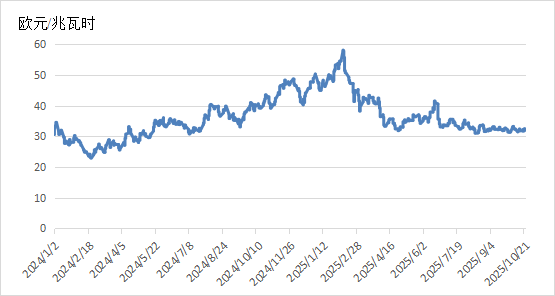 截至10月24日,TTF天然气期货主力合约收于32.016欧元/兆瓦时,月环比上涨0.35%,相较2024年同期的42.154欧元/兆瓦时,下降24.05%。
