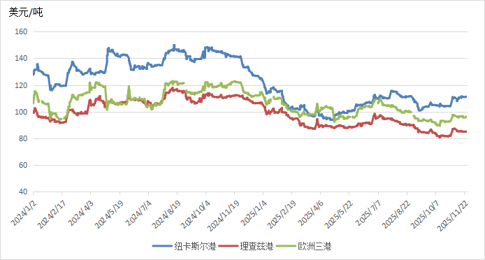 截至11月26日,澳大利亚纽卡斯尔港煤炭期货价格报收于111.15美元/吨,月环比上涨6.62%,相较2024年同期的141美元/吨,下降21.17%;南非理查兹港煤炭期货价格报收于85美元/吨,月环比上涨4.87%,相较2024年同期的111.75美元/吨,下降23.94%;欧洲三港煤炭期货价格报收于96.15美元/吨,月环比上涨4.06%,相较2024年同期的121.65美元/吨,下降20.96%。