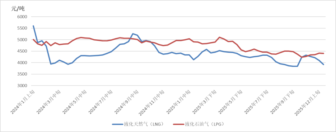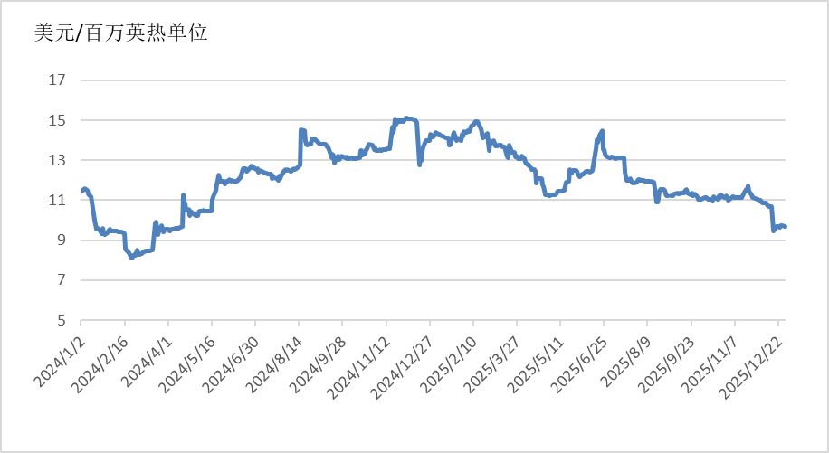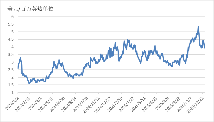 12月,美国天然气价格先升后降。月初,极地涡旋带来的严寒天气和暴风雪席卷了美国大部分地区,美国多处管道等基础设施受影响,部分地区天然气产量下滑。同时,随着美国多地气温大幅下降,供暖用气需求持续上升,LNG出口量在新建工厂加速液化和运输的推动下持续创下历史新高,截至12月3日当周的天然气库存总量为3923亿立方英尺,尽管比5年平均水平高出5%,但与上年同期相比则下降了1%,上述因素共同推动美国天然气价格强势上涨至5美元/百万英热单位以上。12月5日,美国Henry Hub天然气价格收于5.337美元/百万英热单位,为2022年12月以来最高水平。12月中下旬,美国大部分地区气温预期高于平均水平,抑制部分采暖需求,天然气产量维持高位、库存充足且降幅不及预期,LNG出口量大幅下降至2025年11月以来的最低水平,利空因素强势主导市场,美国天然气期货价格震荡下跌。12月22日,美国Henry Hub天然气价格收于3.994美元/百万英热单位,相较于月初高位暴跌25.16%。