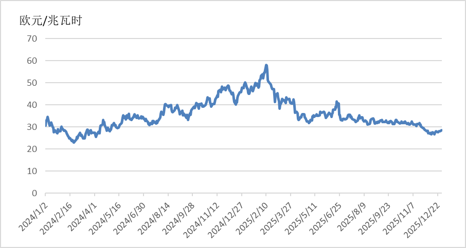 截至12月29日,TTF天然气期货主力合约收于28.534欧元/兆瓦时,月环比下降0.98%,相较2024年同期的47.633欧元/兆瓦时,下降40.1%。