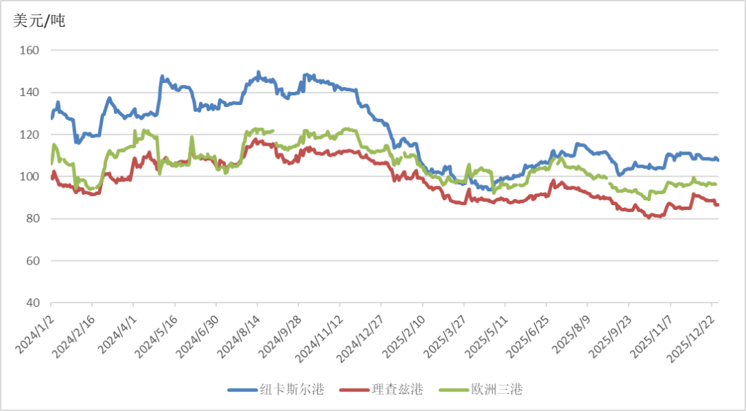 截至12月26日,澳大利亚纽卡斯尔港煤炭期货价格报收于109.05美元/吨,月环比下降1.89%,相较2024年同期的126.75美元/吨,下降13.96%;南非理查兹港煤炭期货价格报收于86.45美元/吨,月环比上涨1.71%,相较2024年同期的106.3美元/吨,下降18.67%;欧洲三港煤炭期货价格报收于96.48美元/吨,月环比上涨0.34%,相较2024年同期的112美元/吨,下降13.86%。