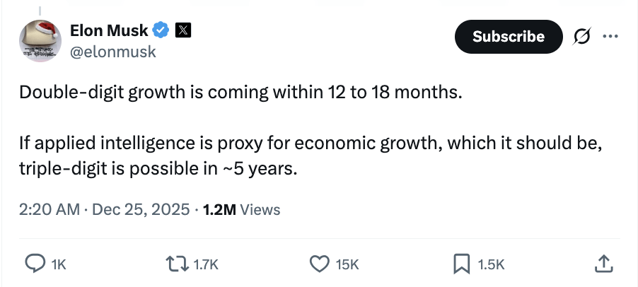 圣诞前夜,马斯克再次语出惊人。他不仅预言美国经济将在18个月内迎来两位数暴涨,更抛出了一个令经济学家窒息的推论:在AI应用智能的加持下,五年内的经济增速将突破三位数。