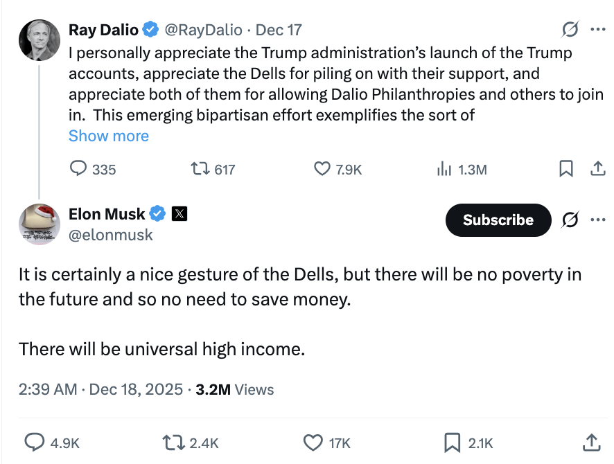 正因如此,面对瑞·达利欧为后代设立的百亿储蓄计划,马斯克才会毫不留情地嘲讽:“姿态很友好,但毫无意义。”