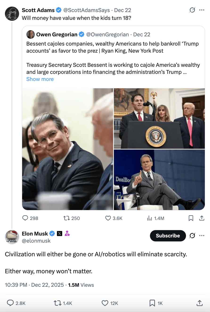马斯克在回应关于孩子们18岁时金钱价值的问题时表示:“文明要么毁灭,要么AI/机器人将消除稀缺。无论哪种情况,钱都不重要了。”