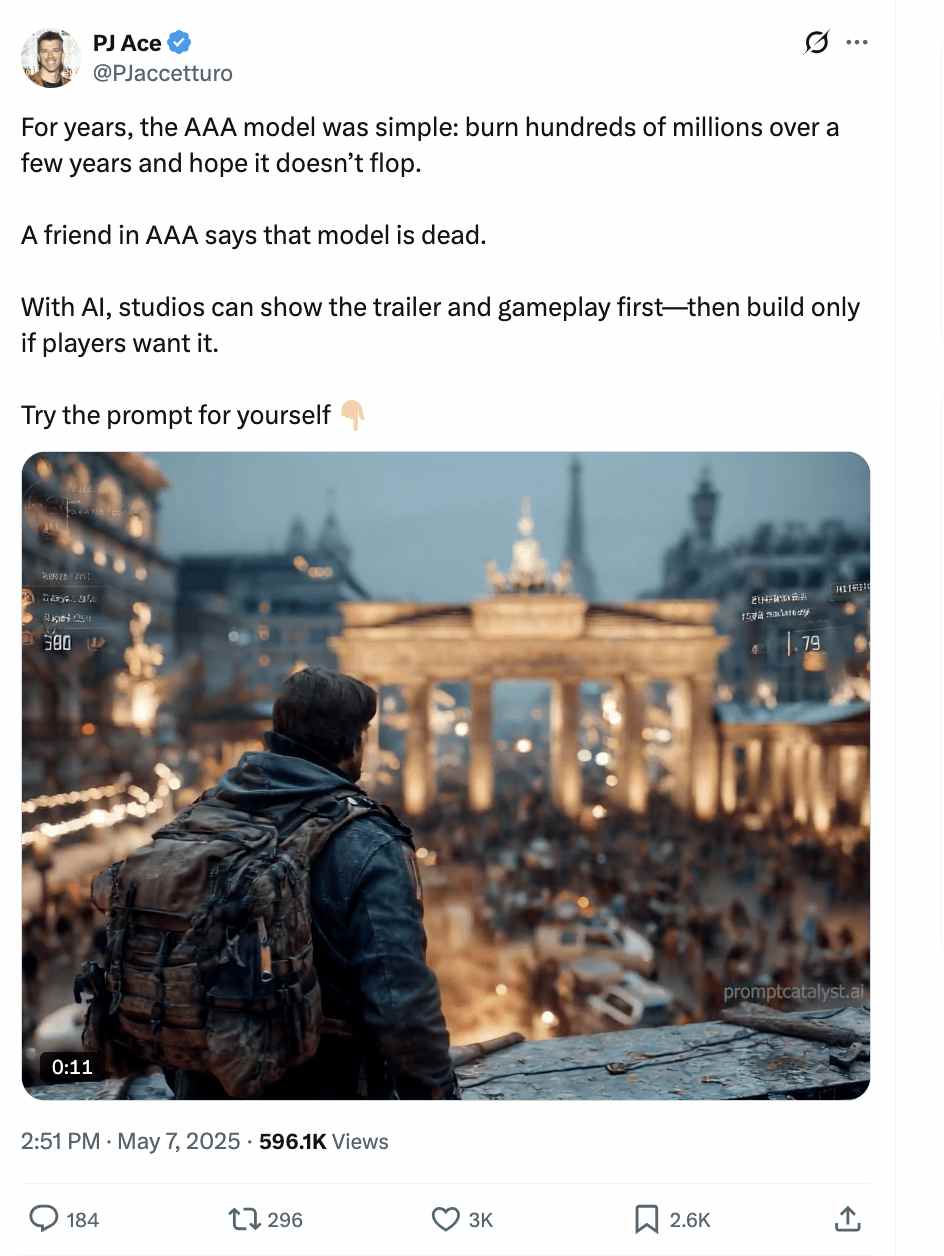 有用户更是认为,传统3A游戏开发模式已死。现在,AI允许工作室先生成预告片和玩法来测试玩家兴趣,再决定是否投入开发,从而极大降低风险。AI将让游戏行业从动辄数年、数亿美元的开发周期,转向高效的原型测试。