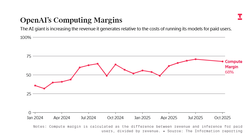 据知情人士透露,OpenAI的计算利润率(即为付费用户运行AI模型后的收入分成),已从2024年1月的约35%、去年年底的约52%,跃升至今年10月份的约70%。