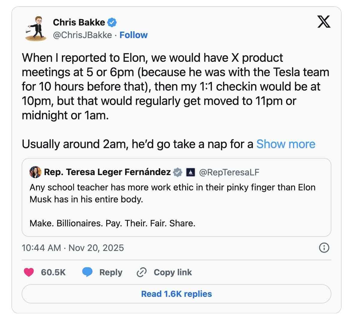 下午5点或6点左右,他的注意力会无缝切换到X。公司的产品会议通常会持续到深夜。巴克回忆了一个令人崩溃的细节:他与马斯克的每周一对一汇报,原本定在晚上10点,但实际上会议经常被推迟到晚上11点、12点,甚至凌晨1点。