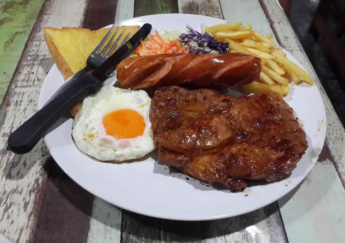 “牛排、鸡蛋,还有咖啡。”