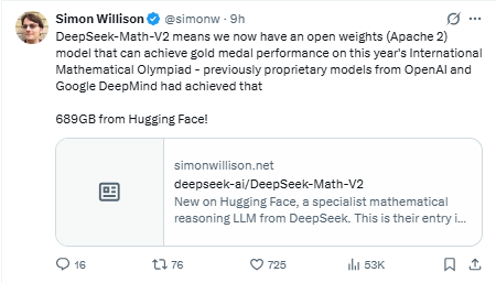 技术博主、英国程序大佬西蒙·威利森(Simon Willison)快速对 DeepSeek Math-V2的发布做了技术层面解读,强调这是一个开放权重模型。他还特意提到,OpenAI和谷歌的同等模型有将近700G,相比之下DeepSeek Math-V2要小得多。