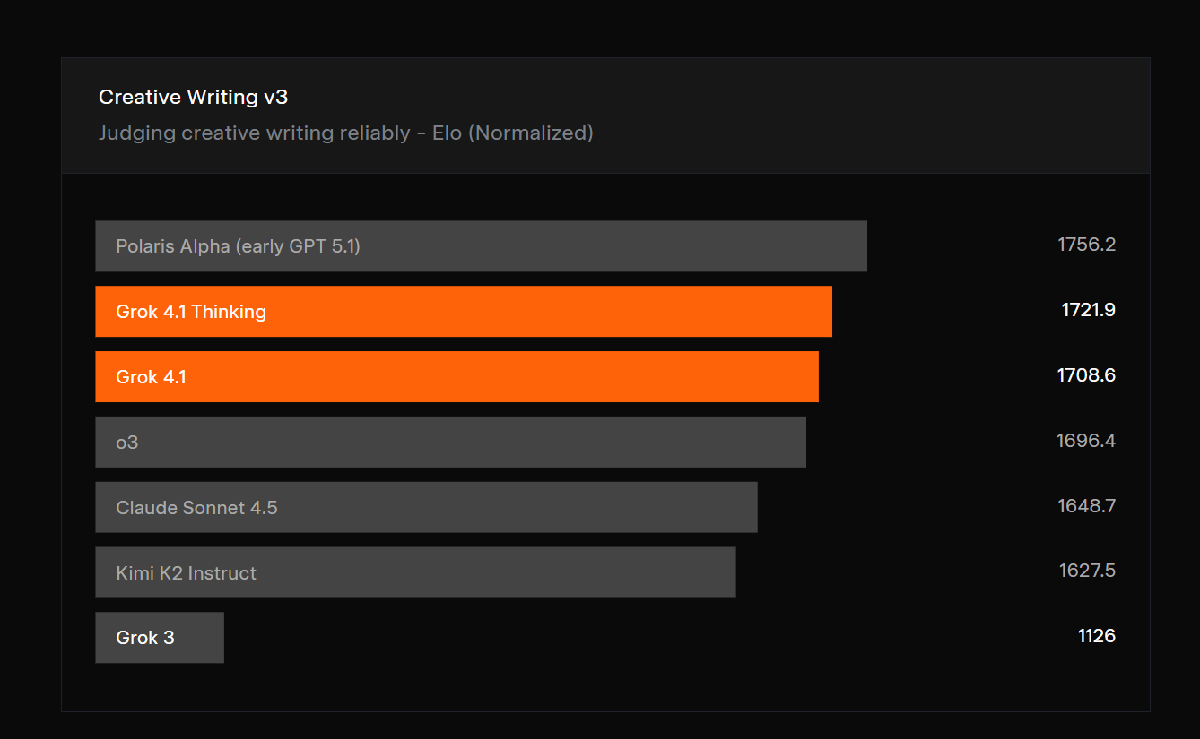 · 创意写作能力(Creative Writing) xAI同样测量了Grok 4.1在Creative Writing v3基准测试中的表现。在该测试中,模型需要根据32个不同的写作提示,在3次迭代中生成回答。