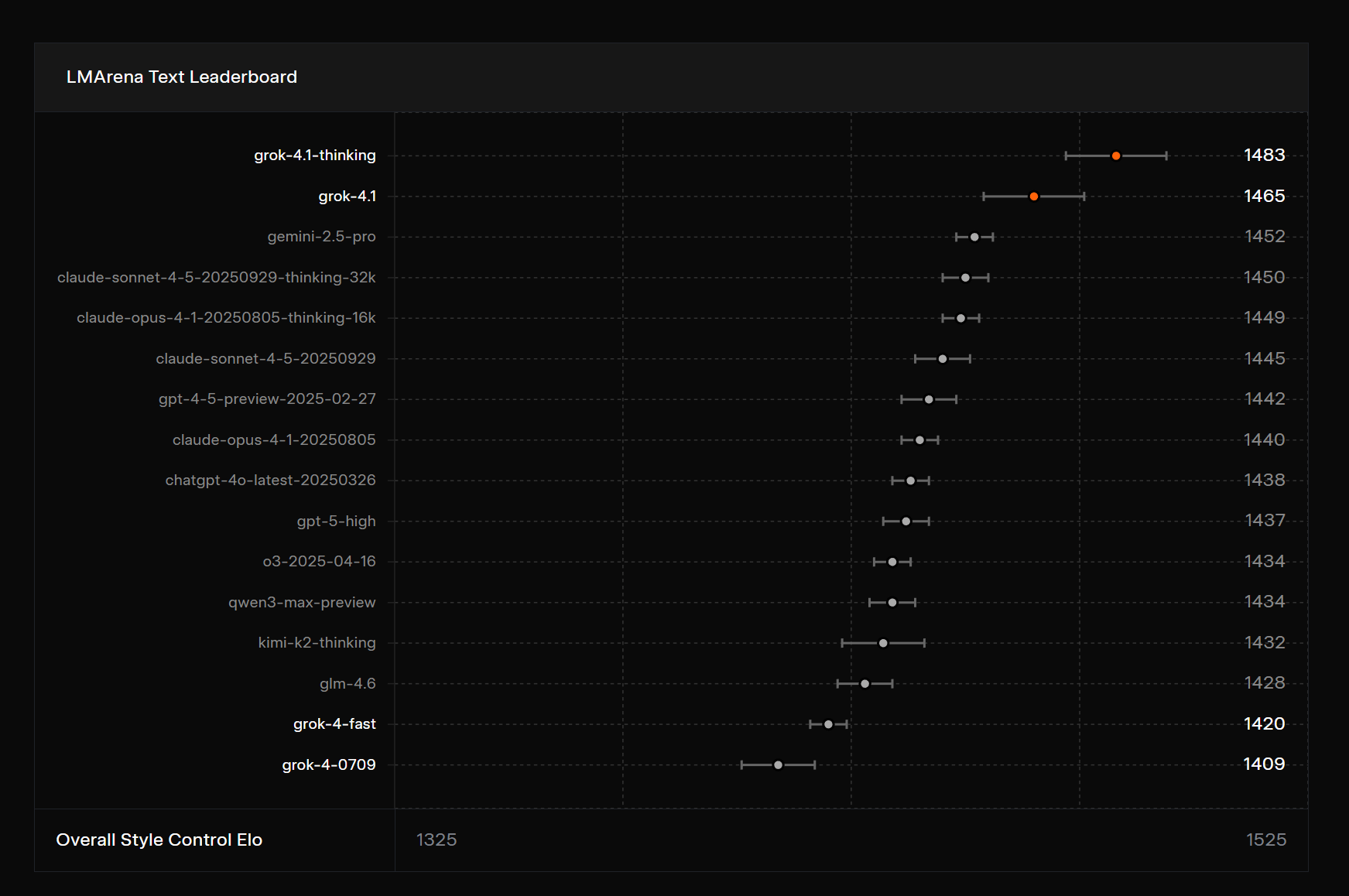 · Grok 4.1的“思考模式”(代号:quasarflux)以1483 Elo的成绩位列总榜第一,领先所有非xAI模型31分。