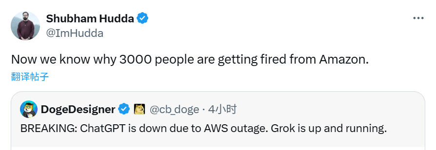 有X用户还颇具讽刺意味地将导致ChatGPT的AWS业务中断与裁员联系起来,调侃道“现在知道亚马逊为啥要裁3000人了”,暗指裁员期间内部员工对技术可靠性的怨气。