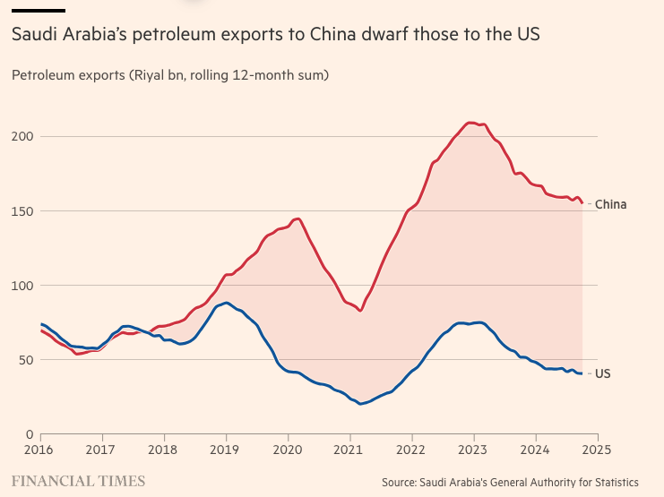 在纳赛尔履职的10年间,沙特对中国的石油出口价值增长超两倍,于2022年达到560亿美元的历史峰值。仅在这一年,沙特所开采的石油,近六桶中就有一桶运往中国的炼油厂。