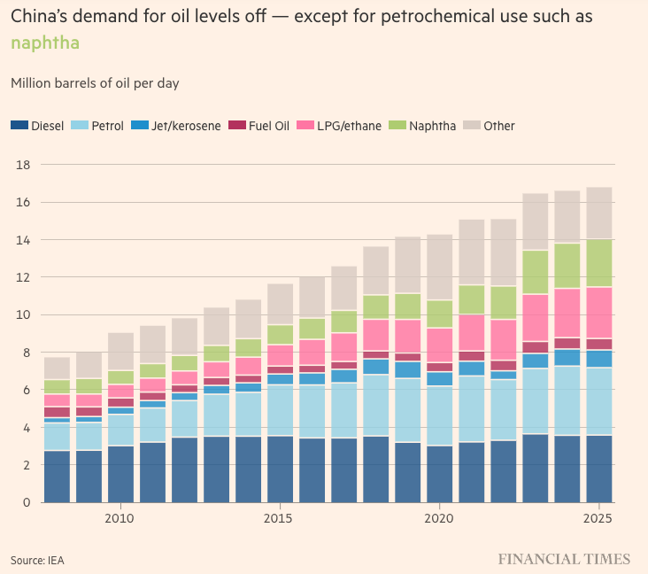 国际能源署(IEA)的希利(Healy)与纳赛尔的观点相呼应,他指出,过去五年间,中国石化需求增长部分“约四分之一”源自风力涡轮机和太阳能电池板,并且未来中国石油使用量的增长,“基本上”会来自石化行业。