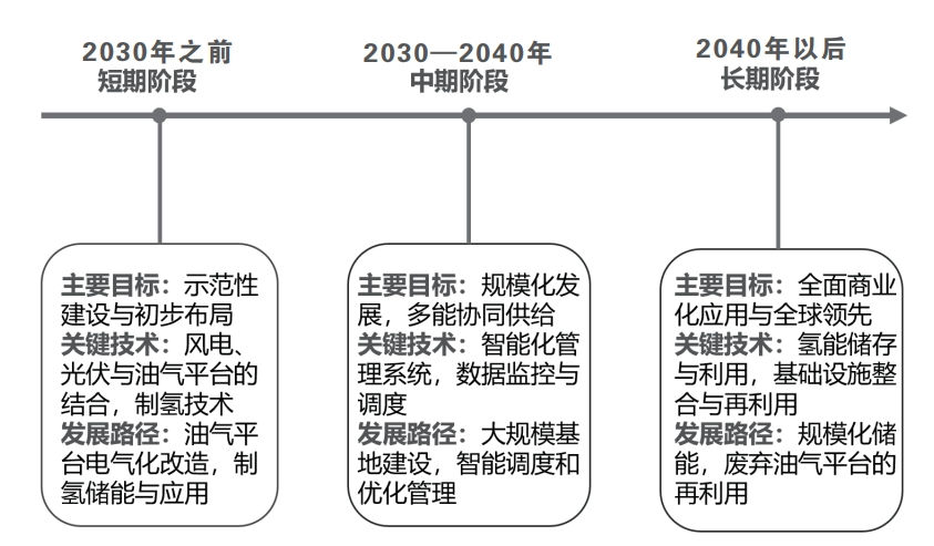 海上综合能源系统的发展可分为三个阶段:短期(2030年之前)、中期(2030—2040年)和长期(2040年及以后),每个阶段需明确具体目标和实施路径。短期内,重点是完成初步布局和示范性建设,结合海上风电、光伏与油气平台,实现油气平台的电气化改造,减少对燃气发电的依赖,并推动制氢技术的应用,以实现多样化的能源储存。中期目标是实现规模化发展,建设集成风电、光伏、海洋能和油气平台的大型综合能源基地,形成多能互补的供应体系,同时推动智能化管理和能源调度系统的实施,通过大数据和人工智能技术提高能源利用效率和系统稳定性。长期发展则旨在实现全面商业化和全球领先,尤其是在储能技术方面取得突破,特别是氢能的储存与利用。同时,废弃油气平台将被广泛用于风电、光伏和海洋能的转换与储存,以促进可持续的海洋资源利用。通过持续的技术创新和政策支持,海上综合能源系统将在全球能源转型中扮演重要角色。