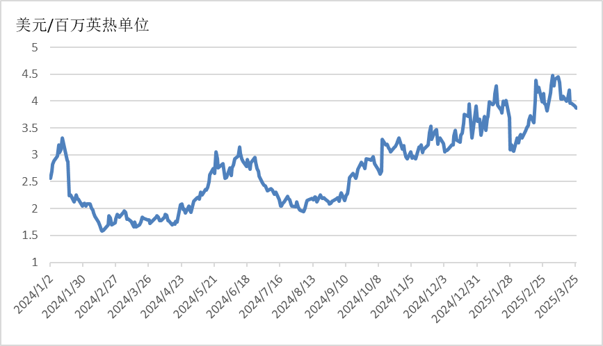 截至3月27日,美国Henry Hub天然气主力合约收于3.92美元/百万英热单位,月环比下降0.51%,相较于2024年同期的1.72美元/百万英热单位,上涨127.91%。