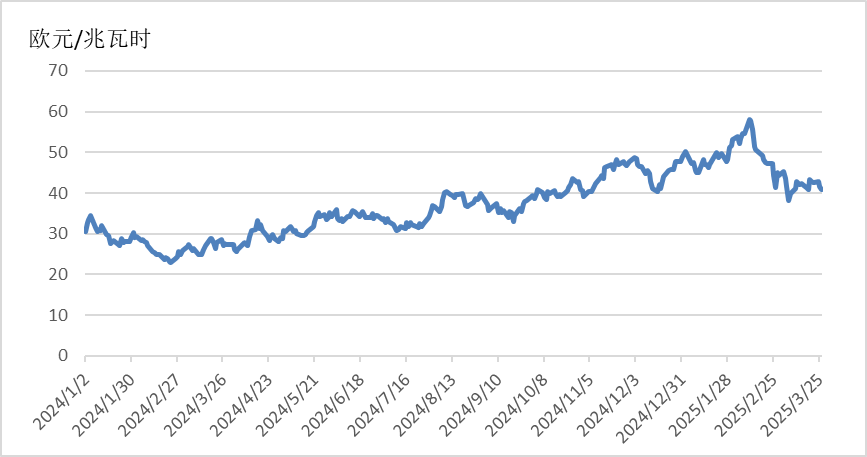 2025年3月,欧洲天然气价格高位震荡。3月初,受天气转暖影响,西北欧大陆地区居民和商业用气量有所下降。虽然近期欧盟去库速率加快,天然气库存为整体储气能力的35.88%,较去年同期下跌40.67%,但欧洲LNG进口量攀升打压市场氛围。此外,虽然美乌双边谈判不欢而散,但白宫可能放松对俄罗斯制裁以及美俄之间潜在的能源合作协议签署预期或增加俄罗斯对欧洲的天然气供应,上述利空因素主导市场,欧洲天然气价格持续下跌至40欧元/兆瓦时以下。3月6日,TTF天然气期货价格收于38.24欧元/兆瓦时,为4个月以来最低值。当地时间3月7日,乌克兰多个州的电力和天然气基础设施遭大规模俄罗斯导弹和无人机袭击,部分要害节点的天然气供应中断。此外,北海部分气田将进行检修,挪威管道系统内的输气量减少更是加重了市场对于供应下降的担忧,叠加较低的天然气库存,上述因素共同推动TTF价格上涨至42欧元/兆瓦时以上,随后维持在40~44欧元/兆瓦时之间高位震荡。3月末,欧洲LNG进口量上涨,且欧洲即将进入天然气消费淡季,欧盟开始进入注库周期,利空因素再次主导市场,TTF天然气期货价格偏弱震荡。