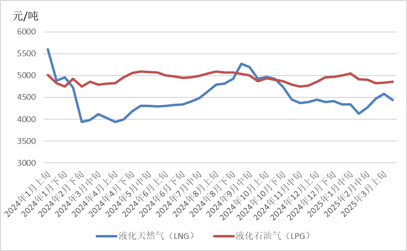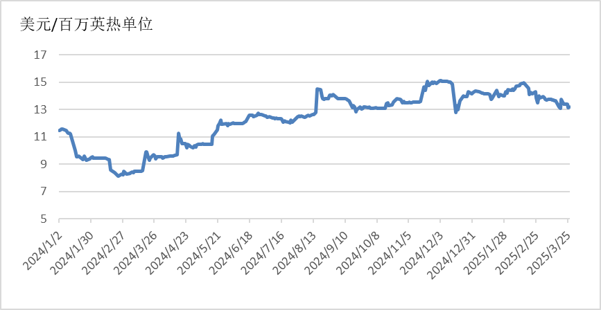 截至3月27日,普氏日韩LNG(JKM)期货价格收于13.175美元/百万英热单位,月环比下降5.79%,相较2024年同期的9.4美元/百万英热单位,上涨40.16%。