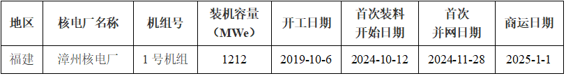 表1:2025年1-12月商运核电机组信息