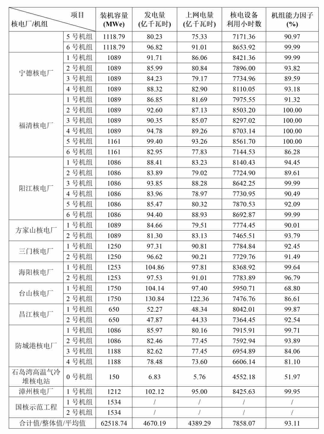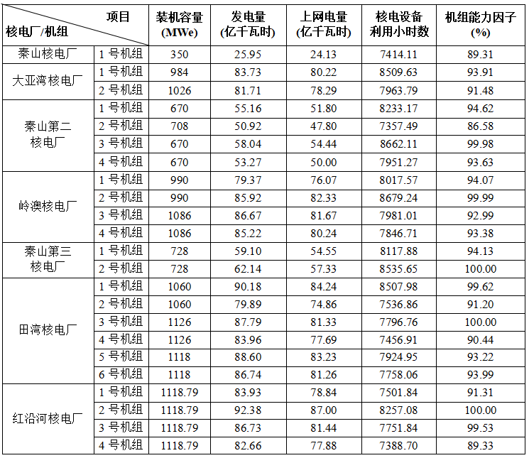 1)本表“合计值/整体值/平均值”中,装机容量、发电量、上网电量为各机组合计值,核电设备利用小时数为全部机组整体值,机组能力因子为全部参与统计机组的算数平均值。
