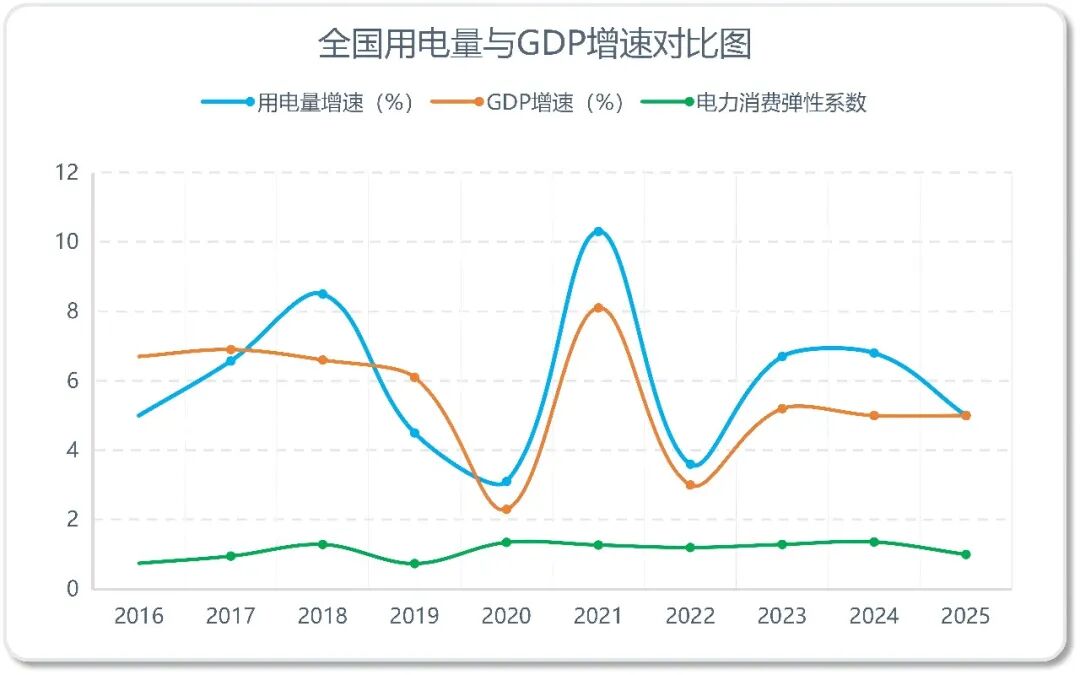 2025年,我国经济发展与电力消费同频增长,核心指标实现双突破:全国GDP达1401879亿元,首次站上140万亿元台阶,全社会用电量累计103682亿千瓦时,首次突破10万亿千瓦时大关,两大指标同比增速均为5.0%,经济增长与电力消费形成高效适配。