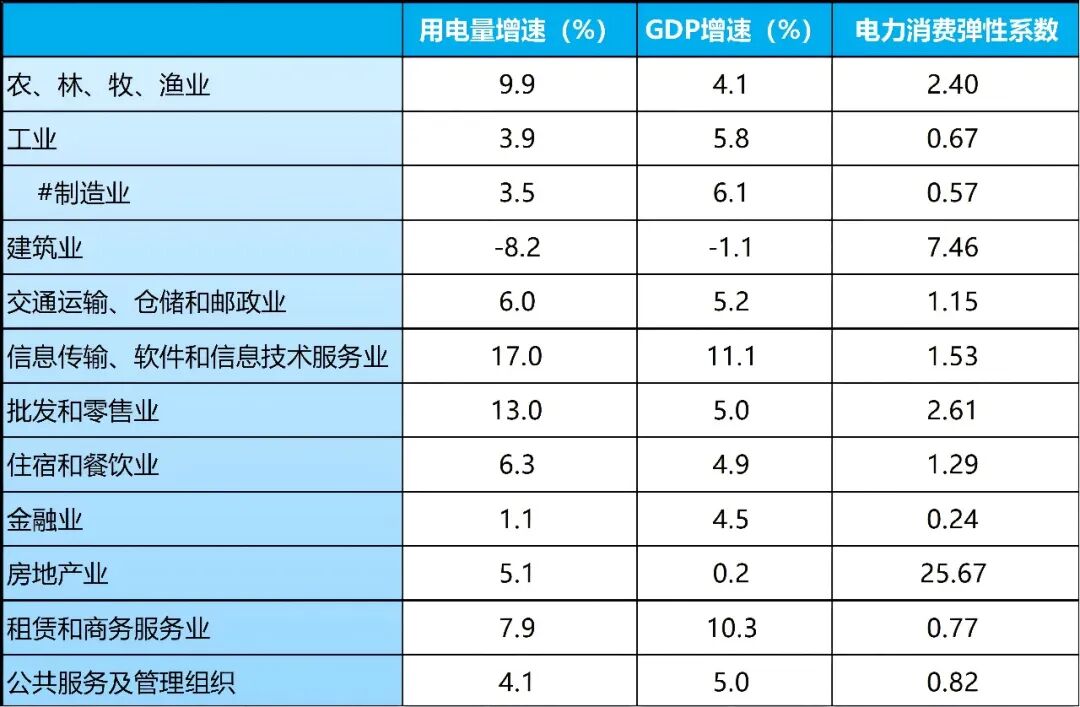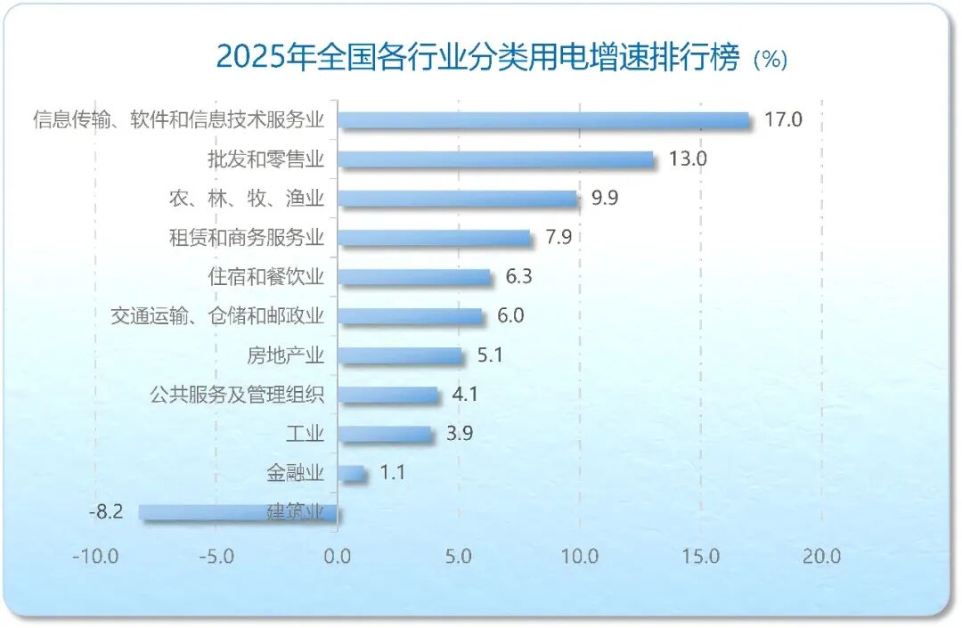 2025年,全国用电量高速增长的行业包括信息传输、软件和信息技术服务业(17.0%)、批发和零售业(13.0%)、农、林、牧、渔业(9.9%),增速在8%以上;建筑业是唯一用电量负增长的行业,增长率为-8.2%。各行业分类用电增速排行如下: