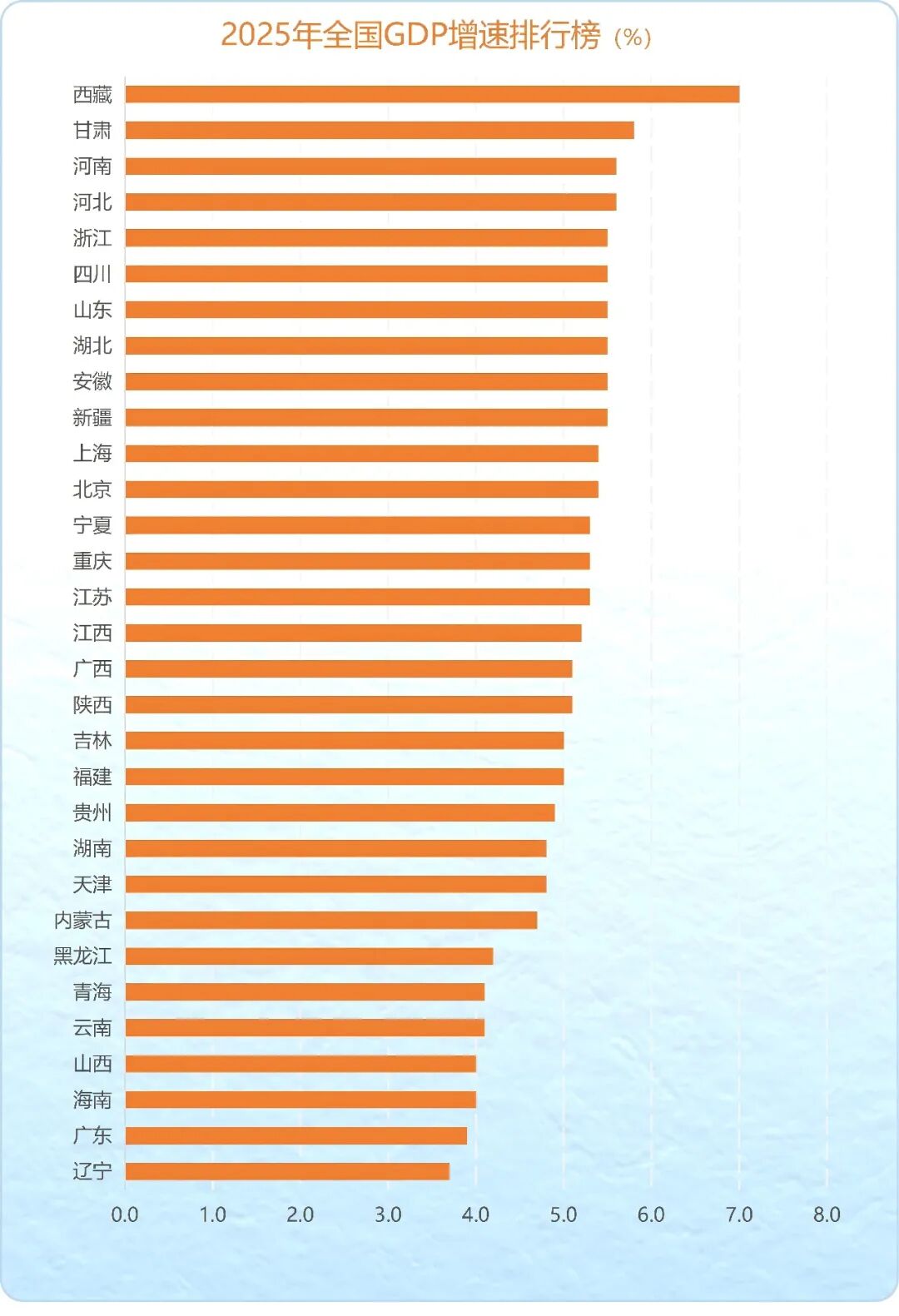 2025年,全国各省区GDP均实现正增长。其中,西藏、甘肃、河南、河北、浙江、四川、山东、湖北、安徽、新疆、上海、北京、宁夏、重庆、江苏、江西、广西、陕西18个省份GDP增速跑赢了全国增速(5.0%);福建、吉林的GDP增速与全国持平。2025年全国各省GDP增速排行如下: