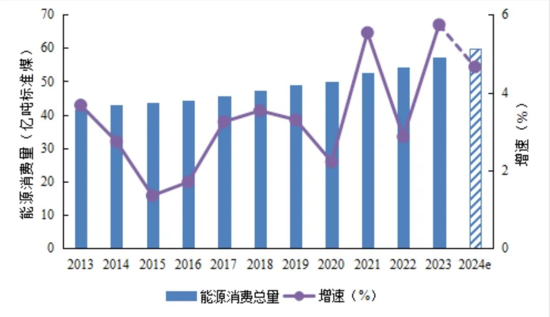 过去十年,我国一次能源消费量持续增加,从2013年的41.7亿吨标准煤增长至2023年的57.2亿吨标准煤,年均增速为3.2%(如图1所示)。2024年,我国一次能源消费总量预计将达到近60亿吨标准煤,同比增长约4.7%,增速与2023年相比有所放缓,但仍高于过去十年平均水平。近两年来,我国能源消费保持刚性增长,能源消费弹性系数从逐渐下降反弹至1左右。