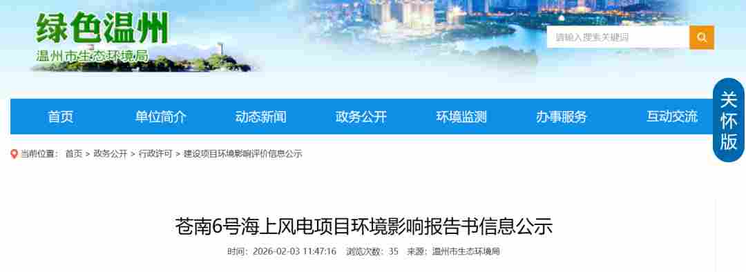 2月3日,温州市生态环境局发布《苍南6号海上风电项目环境影响报告书信息公示》。