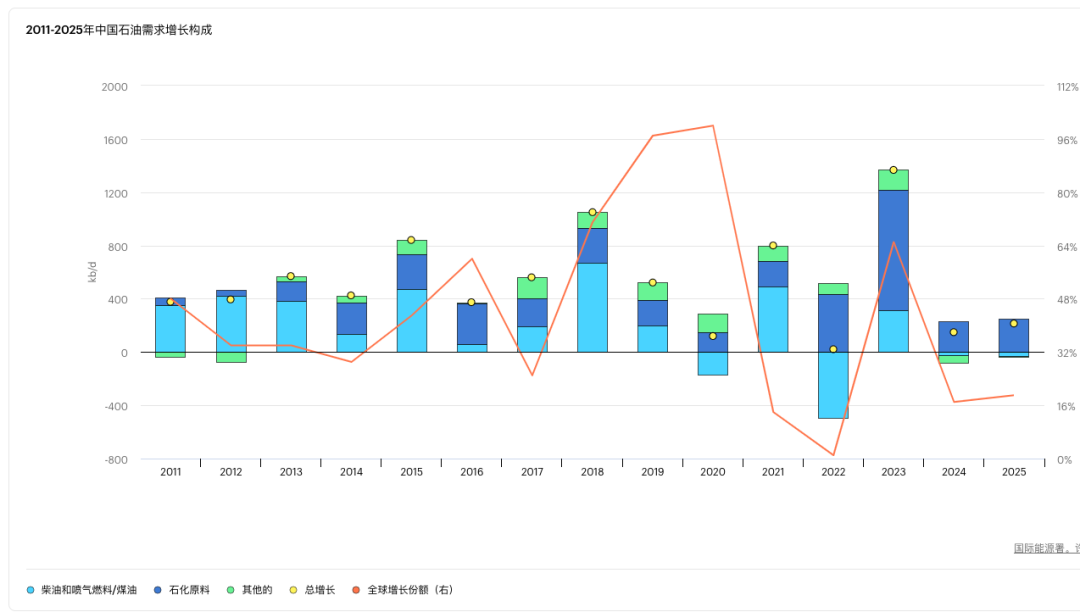 值得注意的是,在2013年至2023年期间,中国在全球石油总需求增长中所占的比重超过了60%,但在去年(2024年),这一占比已降至不到20%。这一变化的主要原因正是中国国内石油燃料使用量的增长放缓。