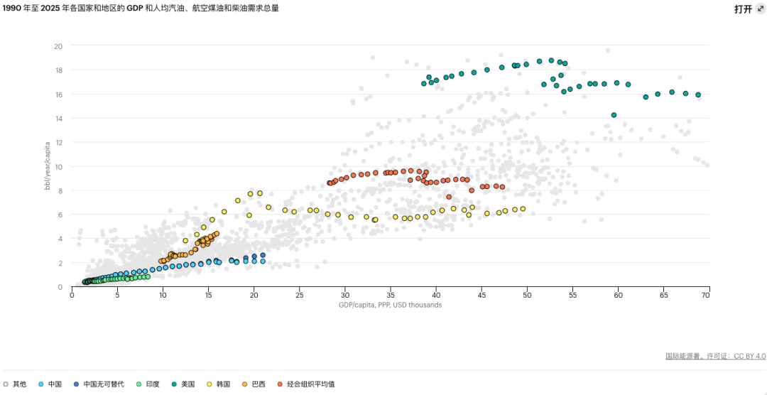 在历史上,几乎没有燃料需求增长轨迹趋于平稳的先例。最接近中国当下情况的例子可能是韩国在20世纪90年代中期的经历。当时,韩国在GDP快速增长的同时,燃料消费量却趋于稳定,而且当时韩国的人均燃料消耗量是中国当前水平的三倍多。在此后的几十年里,即便韩国已迈入高收入国家行列,其燃料需求也几乎没有增长。韩国的这一发展历程充分凸显了单纯基于不同经济体之间结果趋同来预测石油需求所存在的局限性。