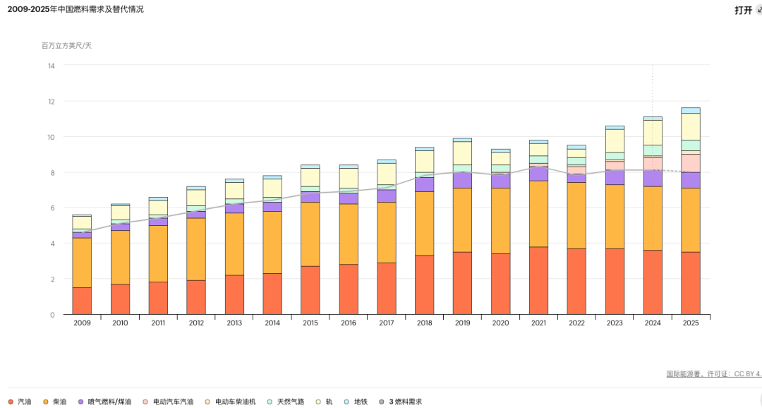 在运输技术革新方面,电动汽车的发展势头尤为迅猛。目前,电动汽车的销量已占据中国汽车总销量的近半壁江山。仅在2024年,电动汽车的普及就使新产生的燃料需求减少了3.5%。与此同时,公路货运领域中压缩天然气和液化天然气的广泛应用,又进一步替代了2%的传统燃料需求。