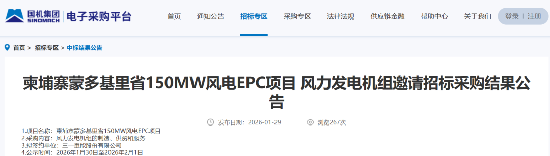北极星风力发电网获悉,近日,国机集团发布《柬埔寨蒙多基里省150MW风电EPC项目风力发电机组邀请招标采购结果公告》。