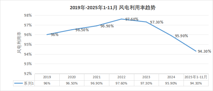 136号文之于行业的震荡,是一次不亚于"平价"初期的深刻讨论和对未来不确定性的担忧。但从产业发展数据来看,一个更严峻的现实已经横亘眼前:根据国家能源局数据,2024年全国风电利用率为95.9%,同比下降1.4个百分点,2025年1-11月,全国风电利用率为94.3%,呈继续下降趋势。风光发电利用率的下降也同步体现在设备利用小时上,中电联数据显示,2024年,全国并网风电利用小时数为2127小时,同比降低107小时。