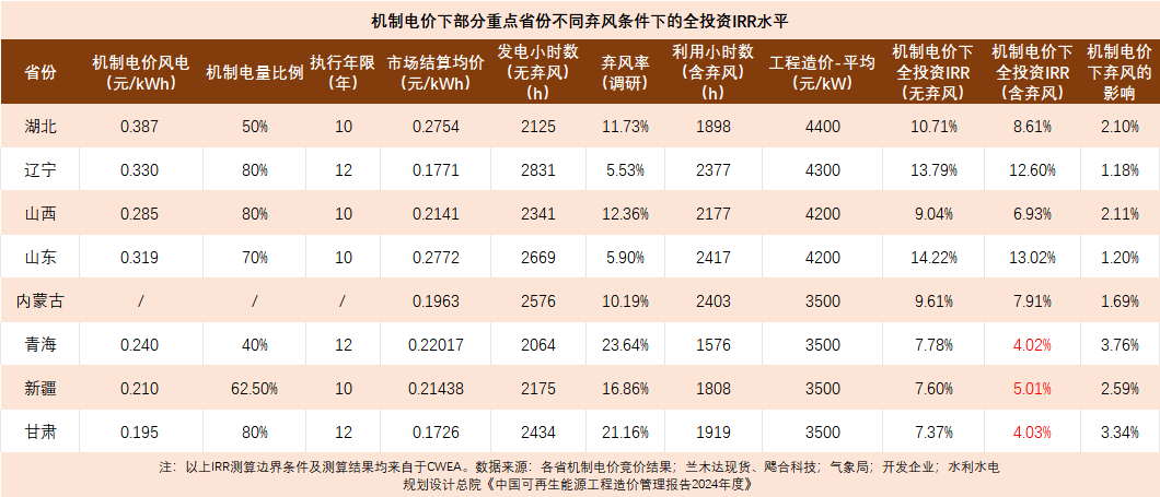 不享受机制电价的项目,以当前交易电价水平,无弃风因素下仅两个省份全投资收益率低于6%;考虑实际弃风率,一半以上省份全投资收益率低于6%。