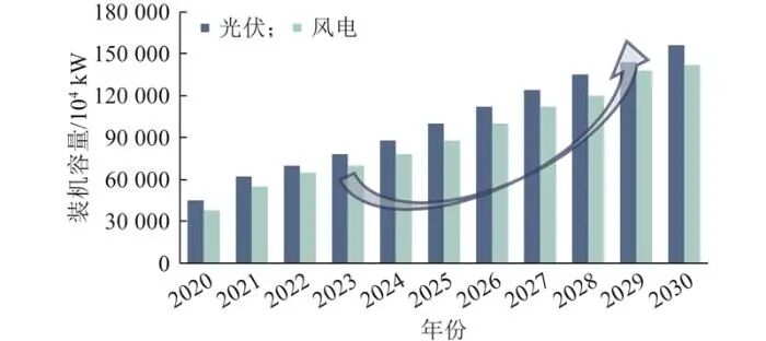 新型电力系统建设背景下,中国新能源实现跨越式发展。截至2024年底,中国光伏和风电装机规模达14.1亿kW,约占总装机的42%。风电、光伏年均装机增速分别达到约20%、约60%,远超同期火电装机增速约4%。光伏风电发电量达1.83万亿kW·h,约占全社会用电量的18.5%。预计到2030年,中国风电和光伏总装机、发电量有望达到26.2亿kW、3.57万亿kW·h,分别占总装机、总发电量的49%、29%,如图1、2所示。随着新能源规模的持续提升,电网安全运行和新能源消纳矛盾显现。当前,国家电网有限公司经营区新能源最大出力占用电负荷比例接近50%,部分区域已超过60%,特别是分布式电源接入比例不断上升,净负荷曲线呈现“驼峰曲线”-“鸭子曲线”-“峡谷曲线”的形态演变,造成晚高峰时段电力需求急速上升,保供压力不断增大。
