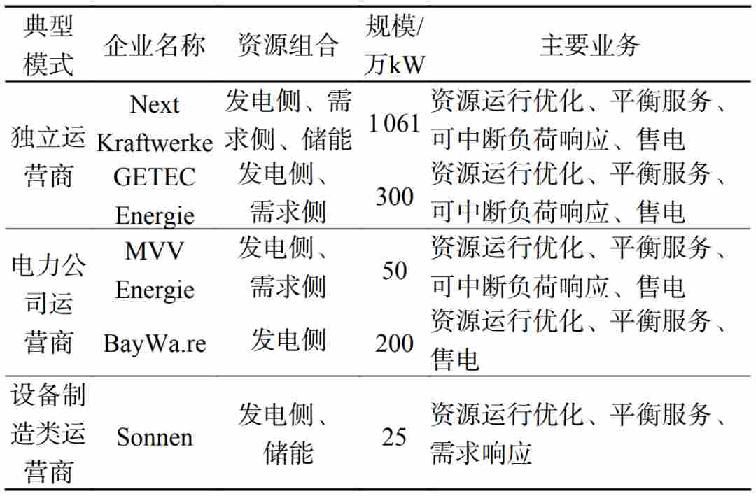 建设运营主体包括以下3种类型:1)独立运营商,其不拥有所聚合对象的产权,仅通过具备先进优化控制算法的虚拟电厂软件平台聚合资源参与市场获利,例如NK公司、GETEC Energie等;2)电力公司运营商(输电网公司除外),利用资源优势将自身的发电资源、负荷用户等聚合形成虚拟电厂,例如MVV Energie、BayWa.re等;3)设备制造类运营商,在出售光伏、储能等设备的同时通过附加智能终端和信息平台实现聚合,例如Sonnen等。典型运营主体如表1所示。