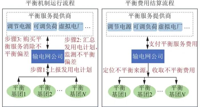 平衡基团通过引导其内部发用电资源确保局部平衡,输电网公司则汇总下辖所有平衡基团的发用电情况得出其调度区域内的整体平衡情况,若有需要则从平衡市场(类似于国内辅助服务市场)购买调节服务,并将费用分摊至各平衡基团,如图4所示。