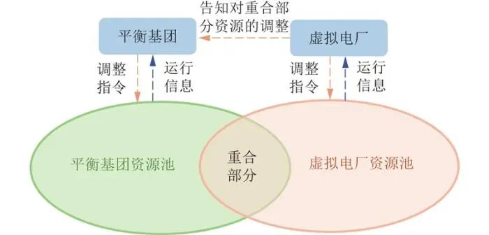 虚拟电厂和平衡基团均为一系列发用电资源的虚拟聚合体,但属于不同的市场主体。两者具有相似性且覆盖的资源可以重合,也可由同一主体运营(平衡基团责任方同时是虚拟电厂运营商)。值得说明的是,当两者由不同主体运营时(如图6所示),虚拟电厂有义务将其对重合部分资源的调整指令及时通知平衡基团并获得其明确批准,以避免影响基团内部平衡。