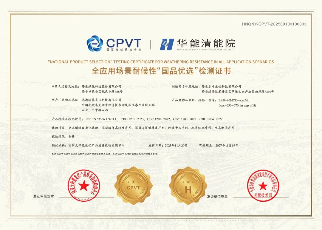 据了解,CPVT与华能清能院颁发的“国品优选”全应用场景耐候性检测证书,是基于IEC 63556相关标准,对光伏产组件在“生态湖泊、沙漠干热、冰雪极地、深蓝海洋”等多种应用环境下的耐候性能进行的全方位严苛序列模拟测试。