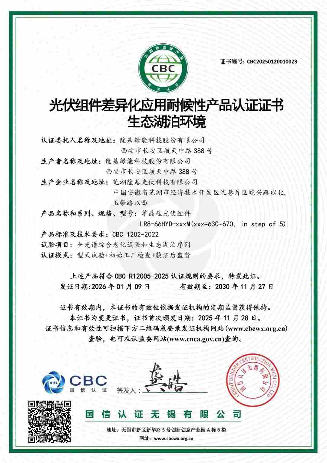 近日,隆基BC二代组件Hi-MO 9成功通过湖泊、沙漠、冰雪、海洋应用环境40+项全场景测试序列,获颁国家太阳能光伏产品质量检验检测中心(以下简称CPVT)与华能清能院基于IEC63556标准的全场景应用证书。作为光伏行业首张组件“全场景可靠性”认证,该证书再一次有力印证了Hi-MO 9组件在复杂多变的外部环境中依然可保持高效稳定发电的卓越品质。