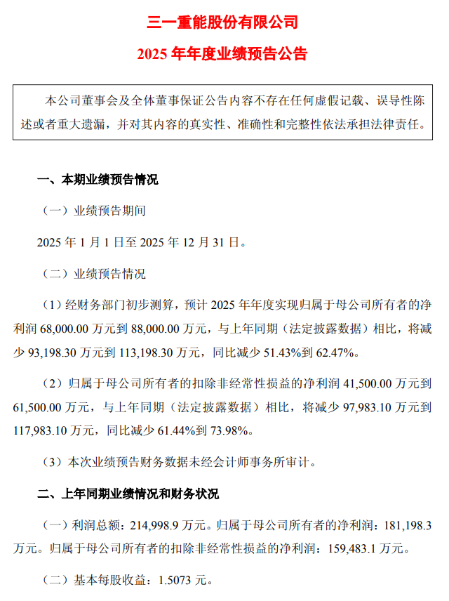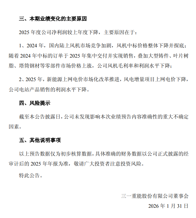 2026年1月31日,风电整机商巨头三一重能股份有限公司发布了2025年年度业绩预告,公告显示,经财务部门初步测算,三一重能预计2025年实现归属于母公司所有者的净利润为6.8亿元至8.8亿元。