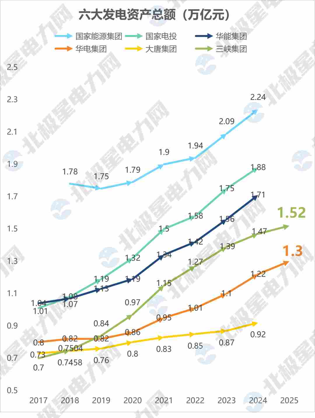 2026年初,仅三峡与华电公布了2025年资产规模,其他几家暂未公布。截至2025年底,三峡集团资产总额达1.52万亿元,华电集团达1.3万亿元,三峡集团依旧领先华电集团。