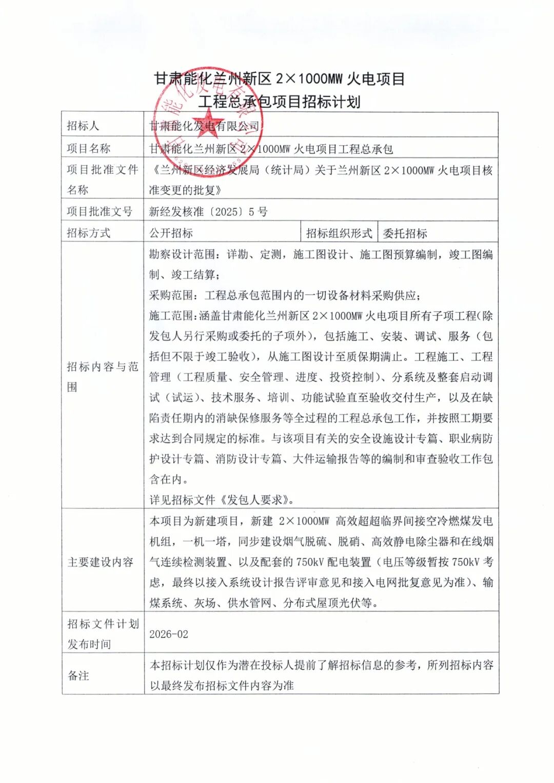 近日,甘肃省公共资源交易网发布甘肃能化兰州新区2×1000MW火电项目工程总承包项目及工程总承包监理项目两项招标计划。